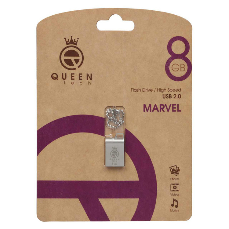فلش مموری کوئین تک مدل MARVEL ظرفیت 8 گیگابایت زیبا و مقاوم است هنگامی که به پورت USB متصل میگردد تنها مقدار اندکی از طول آن در دید قرار میگیرد، این جاست که شما قادرید لپتاپ یا تبلت خود را بدون این که نیاز باشد فلش مموری را جدا نمایید، در داخل کیفتان قرار دهید و به راحتی آنرا با خود حمل کنید. به دلیل بهرهبری از تکنولوژی COB ضد آب، ضد شوک و لرزش و مقاوم در برابر گرد و غبار است. فلش مموری کوئین تک مدل MARVEL به شکلی فشرده طراحی شده، که مفهوم زیبایی آن را نشان میدهد.طراحی بدون قاب این فلش مموری بسیار کاربرپسند است.این محصول مجهز به یک زنجیر کارامد است که احتمال گم شدن فلش مموری را کاهش میدهد. برای انتقال اطلاعات از رابط USB 2.0 بهره میبرد و قادر است سرعت مطلوبی به شما ارایه دهد. این محصول با اغلب سیستم عاملها سازگاری دارد و میتوان از آن در هر دستگاه مجهز به پورت USB استفاده کرد. درنهایت اگر به دنبال یک حافظهی امن و مطمئن برای انتقال اطلاعات با ارزش خود هستید فلش مموری کوئین تک مدل MARVEL انتخاب مناسبی است.