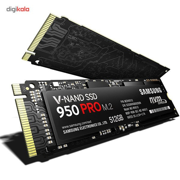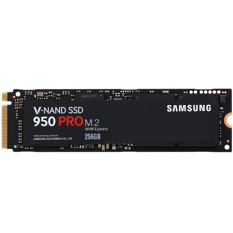 حافظه 950 Pro شرکت سامسونگ (Samsung) یک غول کوچک اما پرسرعت در دنیای ذخیرهسازی است؛ موجودی هیجانانگیزی که در نوامبر سال 2015 به بازار معرفی شد و از همان شروع کار توانست علاقمندان سینه چاکی برای خود دست و پا کند. این حافظهی SSD، یک برد M.2 با سایز 2280 است که از پروتکل بسیار سریع NVMe استفاده میکند. این پروتکل باعث شدهاست دستیابی به سرعت حداکثری 2500 مگابایت بر ثانیه در خواندن و 2200 مگابایت بر ثانیه در نوشتن در این حافظهی SSD میسر شود. رابط نصب 950 Pro به مادربرد، PCIe 3.0 x4 است که میتواند به حداکثر نرخ انتقال 32 گیگابیت بر ثانیه دست پیدا کند. سامسونگ در 950 Pro از تراشههای MLC سهبعدی خود استفاده کردهاست؛ این تراشهها با لیتوگرافی 19 نانومتر تولید شدهاند و مصرف کم برق و سرعت بالا از مشخصههای اصلیشان است. شرکت سازنده تنها دو ظرفیت 256 گیگابایت و 512 گیگابایت را برای این SSD در نظر گرفته و از خیر تولید آن در ظرفیتهای بالاتر گذشتهاست. سرعت باورنکردنی این SSD ها در کنار اطمینانپذیری بالای آنها، به حافظهای منجر شدهاست که یا برای سرورها انتخاب ایدهآلی است یا افرادی که عاشق دنیای سختافزار هستند و حاضرند برای دستیابی به بازده بالاتر تا هر میزانی هزینه کنند. قیمت بالای 950 Pro باعث میشود انتخاب آن تنها برای افرادی میسر باشد که به دنبال بهترین سطح کارایی هستند.
